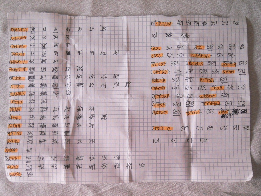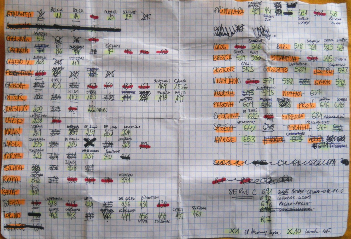 trodat, mi mancano ledesma della lazzije (238), castàn (372) e osvaldo (391) de a riomma, d'agostino (431) del siena, primavera di giuve e grosseto (491), bouy-saba-scaglia del brescia (530), leali-casadei-aquilanti (579) di langeno... poi mi mancano pure ricchiuti (97) del catania che dovrebbe darmelo un mio amico che dice sempre "ma che scherzi?"; lo scudetto della giuve (200) che me l'ha promesso un altro mio amico che sta di turno, blasi (358) di piscara che me l'avessa dà uno scambista per il quale ho lasciato un pacchetto allo spaccio n.1
